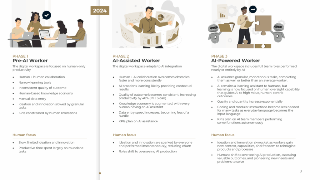 In today’s rapidly evolving technological landscape, Artificial Intelligence (AI) is reshaping the way we work. The impact AI will have on your business is profound. While every industry is marked with experimentation and blind hope for a successful AI deployment, we chose a different approach. Taking a realistic step back to look at the entire picture, we see the road ahead and the pain points every organization and their people will face. We see this divided into three sequential phases of AI integration: the Pre-AI Worker, the AI-Assisted Worker, and the AI-Powered Worker.